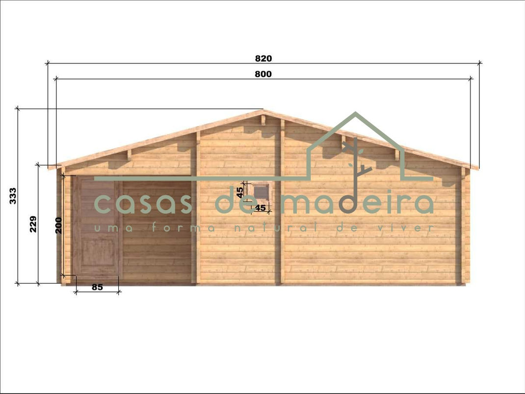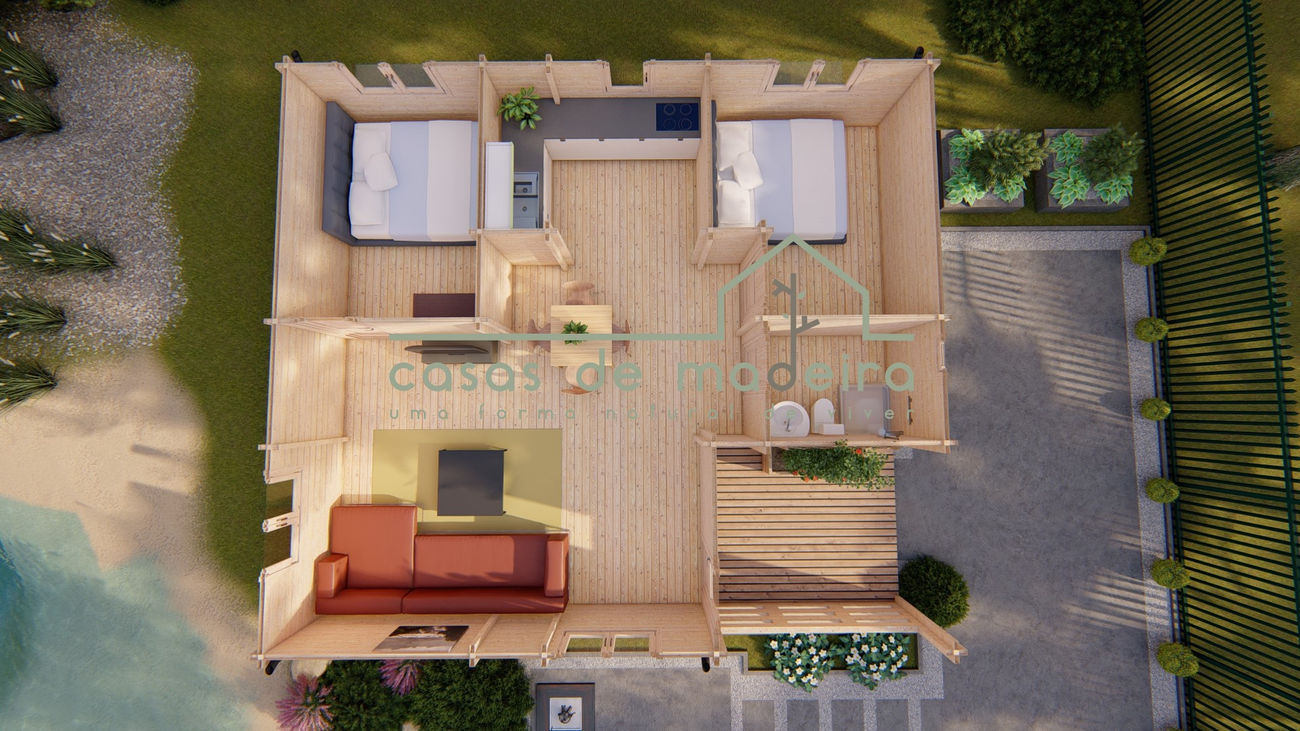 Casa de madeira de 72m2 de área total. Tem uma sala de estar e kitchenette, dois quartos, e uma WC. Dispõe de uma agradável varanda para desfrutar da natureza. Janelas oscilo batentes de vidro duplo. Paredes de 70mm de espessura e disponível também em parede dupla. Custos de entrega (Portugal Continental) e IVA incluídos.